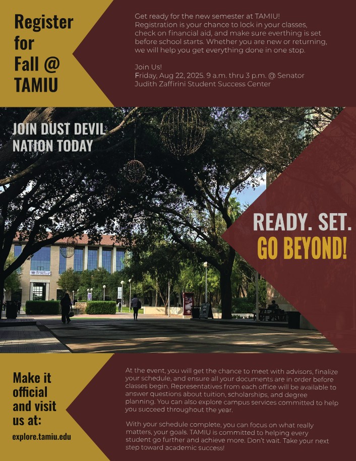 Purpose: This flyer was created to promote registration for the upcoming academic term at Texas A&M International University (TAMIU). The goal was to design a clear and professional promotional piece that encourages students to begin the registration process early and understand the resources available to them.